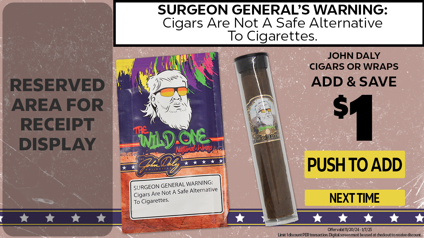 In-Tranaction ad for John Daly Tobacco Products. I was given only the two product shots and based the design off the Wild One paper effect. Client wanted a very generic background and to have the product stand out. Purpose was to get customers to try one. APP image displayed along with this in-store ad.